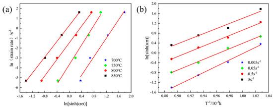 Figure 4. Optimizing the value of n and solving the value of Q for dual-phase Ti555211 alloy by means of linear fitting: (a) ln ε ˙ ln sinh α σ ; (b) ln sinh α σ T 1 .