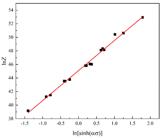 Figure 5. Solving the value of A for dual-phase Ti555211 alloy by means of linear fitting of lnZ-ln[sinh(ασ)].