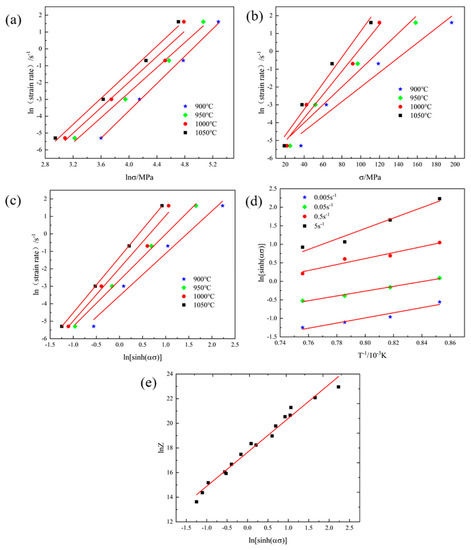 Figure 6. Solving the involved material constants of single-phase Ti555211 alloy by means of linear fitting: (a) ln ε ˙ ln σ ; (b) ln ε ˙ σ ; (c) ln ε ˙ ln sinh α σ ; (d) ln sinh α σ T 1 ; (e) lnZ-ln[sinh(ασ)].
