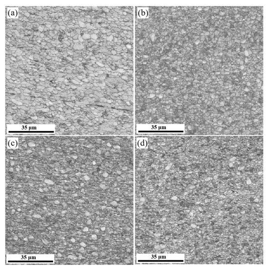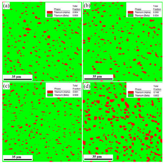 Figure 9. Phase distributions of dual-phase Ti555211 alloy undergoing plastic deformation at various strain rates at 750 °C: (a) 0.005 s−1; (b) 0.05 s−1; (c) 0.5 s−1; (d) 5 s−1.