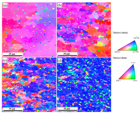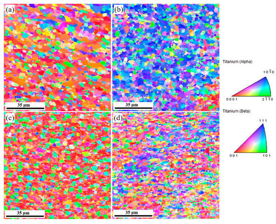 Figure 8. Grain orientation distributions of dual-phase Ti555211 alloy undergoing plastic deformation at various strain rates at 750 °C: (a) 0.005 s−1; (b) 0.05 s−1; (c) 0.5 s−1; (d) 5 s−1.