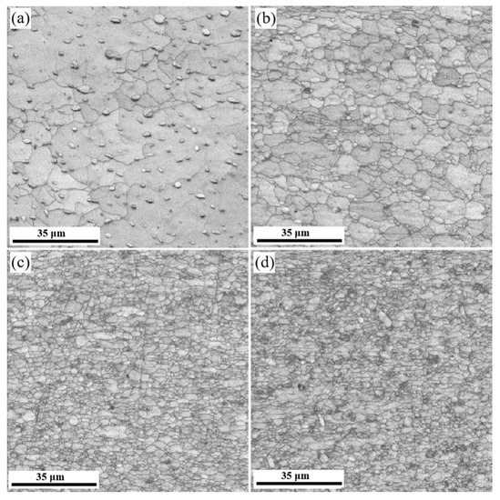 Figure 10. Microstructures of dual-phase Ti555211 alloy undergoing plastic deformation at various strain rates at 850 °C: (a) 0.005 s−1; (b) 0.05 s−1; (c) 0.5 s−1; (d) 5 s−1.