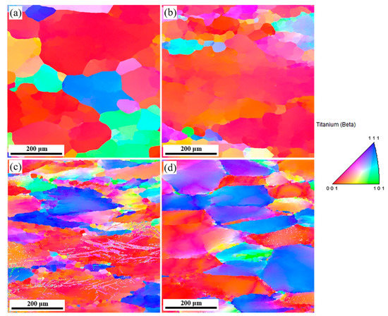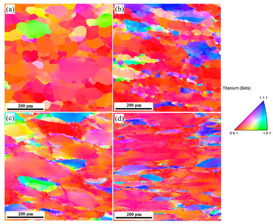 Figure 14. Grain orientation distributions of single-phase Ti555211 alloy undergoing plastic deformation at various strain rates at 1050 °C: (a) 0.005 s−1; (b) 0.05 s−1; (c) 0.5 s−1; (d) 5 s−1.