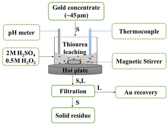 The sample used in this study was a concentrate obtained after a flotation processing of low-grade gold-ore deposits from Newmont corporation, located in Colorado, USA. The chemicals used in the study were of analytical grade. Thiourea (>99.0%) and Hydrogen peroxide H2O2 (30 wt.%) were purchased from Sigma-Aldrich, while H2SO4 (95–98%) was purchased from J. T. Baker.