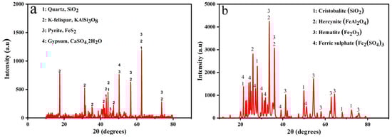 The material was first characterized in this study to understand its mineralogical and chemical composition. The particle size distributions show the size range in which the concentration of minerals with commercial value is most likely to occur. The Microtrac flowSync particle size analyzer was used to evaluate the ore sample’s particle size distributions, and the results are represented as log-normal distributions in Figure 2. The particle size distribution of the gold concentrates results showed that the diameters D10, D50, and D90 values were 2.74, 10.59, and 104.0 μm. The physical appearance of studied samples before roasting was in gray color, and after roasting at 500 °C for two hours became brown (Figure 3a,b). The results of the chemical characterization of the concentrated sample under investigation are presented in Table 1. From the table, the Au and Ag contents were determined as 17.04 ppm and <3.0 ppm, and the major component of the sample includes S (34.5%), Fe (29.26%), Al (3.49%), K (2.69%) and other minor components. Sulfur and iron content represent the presence of the FeS2 phase and confirmed in Figure 4a where the mineral phase analyzed for the sample before roasting shows the presence of pyrite (FeS2) as the major phase, along with K-feldspar, quartz, and gypsum. Figure 4b represents the roasted sample and sulfur converted into sulfur oxides. The phases identified were cristobalite (SiO2), hercynite (FeAl2O4), hematite (Fe2O3), and ferric sulfate (Fe2(SO4)3.