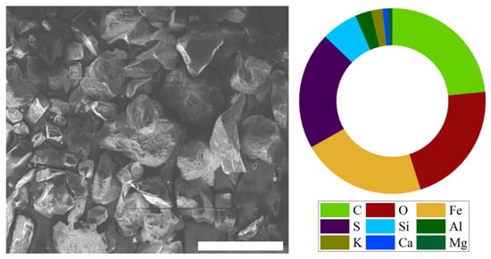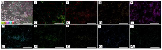 The SEM micrograph in Figure 5a (before roasting) indicates that the sample particles are smooth while Figure 5b (after roasting) shows the rough surface and all have irregular shapes. We also carried out surface and element analysis of the concentrated sulfide gold sample using SEM-EDS, and the results are presented in Figure 6. The semi-quantitative analysis from EDS results represented by the pie chart in Figure 6 showed that the components of the studied sample were C, O, Fe, S, Si, Al, K, Ca and Mg with 23.4%, 21.7%, 21.6%, 20.5%, 6.3%, 2.8%, 2.0, 0.9 and 0.8%, respectively. The major sample components were Fe (21.6%), S (20.5%) and Si (6.3%) in Figure 6 and clearly mapped as depicted in Figure 7a. As the amount of sulfur and iron content was significantly high in the sample, this implied that gold was hosted by sulfide in the form of pyrite (Table 1, Figure 6 and Figure 7a). This was confirmed by the XRD analysis in Figure 4a, which shows the presence of K-feldspar, pyrite, quartz, and gypsum phases with smaller peak intensities.