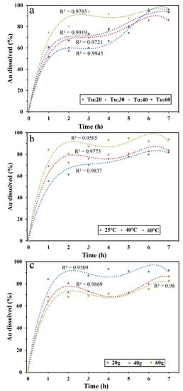 At this concentration, over 70% Au dissolution was realized from a leaching time of 1 h and beyond, while for the other concentrations the same dissolution rate was achieved after a leaching time of 4 h. Although the highest Au dissolution percentage could be seen after 6 h for a Tu concentration of 20 g/L, on average the Au dissolution was higher at 40 g/L. Therefore, the Tu concentration of 40 g/L was taken as the optimum concentration and used for other experiments. In the previous studies where Tu/H2O2 was used in gold extraction, the recovery rate was varied from 69 to 98% from the secondary resources, and the highest obtained from primary resources was 91.94% at 60 °C [25,54]. This study’s results show a recovery rate of 96.2%, which is better and in the same range as the recovery rates shown above.