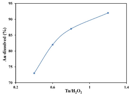 Figure 9 depicts the effect of oxidant-thiourea ratio on gold dissolution during leaching at (pH: 1, 6 h, pulp density: 20 g/L). The figure shows that the increase in the Tu/H2O2 ratio augmented the amount of gold in the solution. However, from the literature, the excess oxidant concentration results in high thiourea consumption and thiourea decomposition, thus limiting the dissolution of gold and making the process expensive [57]. In this experiment, the concentration of hydrogen peroxide was kept constant with the variation in Tu concentration. The higher Au percentage obtained was 92.2% at 1.2 Tu/H2O2 (Figure 9), which is a better condition than the preceding studies showing their optimum ratio at 2 [51].