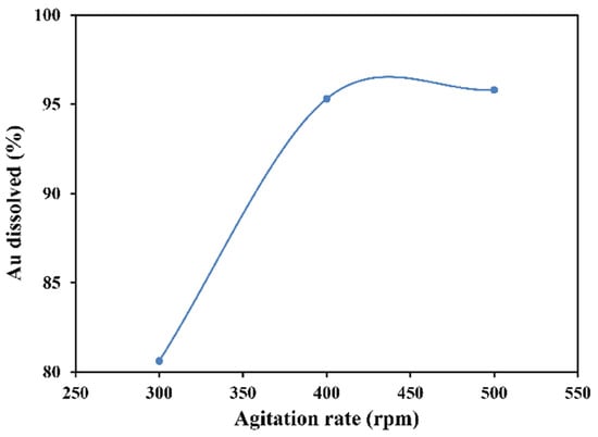 To determine the effect of agitation speeds, 300, 400, and 500 rpm were tested. Gold dissolution in 6 h at 60 °C was recorded as 80.6%, 95.3%, and 95.8% for 300, 400 and 500 rpm, respectively. Figure 10 shows that when the agitation speed was 400 and 500 rpm there was little difference in gold dissolution, whereas at low stirring speed the dissolution dropped to 80%. Therefore, the Au recovery increased with the increase in the agitation rate.