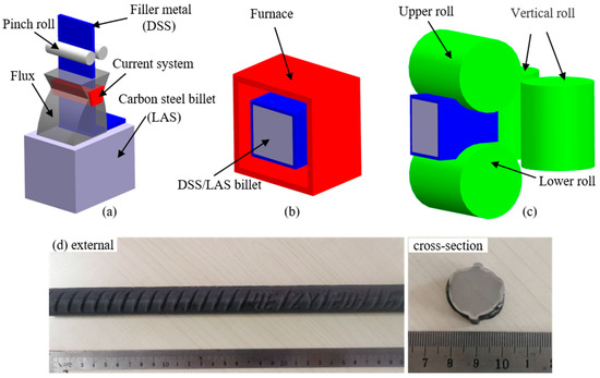 Figure 1. Simplified diagrams of the DSS/LAS-clad rebar production process. (a) The manufacturing of the DSS/LAS billet, which used metal deposition, (b) the DSS/LAS billet soaking in a furnace, (c) hot rolling, (d) macro-scale external and cross-sectional views.