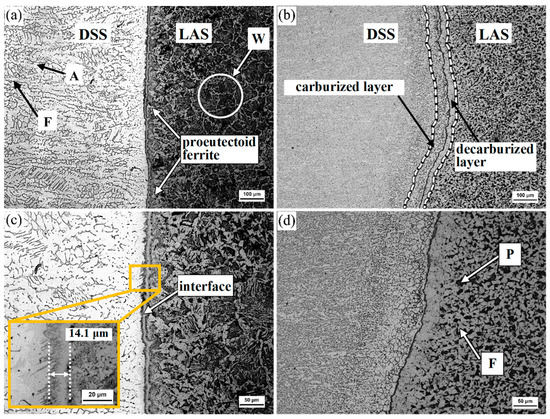 Figure 2 shows the microstructure of the DSS/LAS-clad rebar before and after rolling. We can clearly observe the two-phase structure of ferrite (F, dark black) and austenite (A, light grey) in the DSS, and the Widmanstӓtten (W) structure in the as-deposited LAS, as shown in Figure 2a. After the deposition, proeutectoid ferrite near the interface precipitated before eutectoid transformation. Subsequently, the Widmanstӓtten structure formed on the LAS side because of the high austenitizing temperature and relatively high cooling rate [16]. Compared with the as-deposited, the microstructure of the DSS was significantly refined due to a higher reduction ratio, and Widmanstӓtten was transformed into ferrite (light grey) plus pearlite (dark black) on the LAS side, as presented in Figure 2b. In addition, a carburized layer with a thickness of ~51.7 μm and a decarburized layer with a thickness of ~43.3 μm are located at the interface zone, which can be attributed to the diffusion of C atoms [17]. The thickness of the carburized layer is thicker than that of the decarburized layer, resulting from the long-range diffusion of C atoms. Meanwhile, a single-phase austenite region formed in the carburized layer, as shown in Figure 2d, because C promotes austenite formation. This is in agreement with the research conducted by M. Yan et al. [18]. Moreover, we observe remarkable gradient grain distribution on the LAS side: that is, coarse ferrite in a decarburized layer near the interface and fine pearlite (P) far away from the interface, as shown in Figure 2d. This is because pearlite can stimulate ferrite nucleation during the cooling process [11]. An interface with a needle-like strip structure is shown in Figure 2c; this is most likely to be martensite, according to F. Mas et al. [19]. Additionally, the interface changes a 14.1 μm-thick strip into a line after rolling, as shown in Figure 2d; according to S. Wang et al., this is mainly due to the rolling reduction ratio [11].
