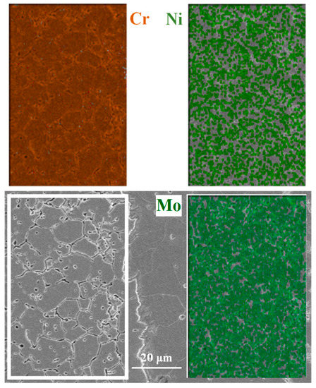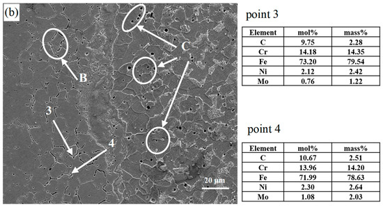 It is interesting to note that, as shown in Figure 3, few carbides precipitate along the ferrite/austenite grain boundaries in the side of the DSS near the interface in the as-deposited metal, compared with the rolled metal. Figure 3a shows that dispersed carbides distribute on the DSS side near the interface in as-deposited, and these carbides are mainly M23C6 and MC [3] according to the result of EDS. However, Figure 3b shows that carbides are mainly distributed along austenite grain boundaries, which are also identified as M23C6 and MC. Compared with Ni, a large number of Cr and Mo atoms present in austenite grain boundaries are observed, as shown in Figure 4. The main reason for this is that strong carbide elements, such as Cr and Mo, have a strong binding ability with C atoms. That is to say, the mechanism of carbide precipitation is different in the as-deposited and rolled materials. Carbides are mainly precipitated from the austenite grain interior after deposition. The main reason for this is that the diffusion of carbon atoms is greatly limited by such a short diffusion time during the cooling process, meaning that it is difficult for a significant number of carbon atoms to diffuse into the DSS side from the LAS side. On the other hand, the coexisting ferrite and austenite interweave with each other in the DSS, which can also reduce the diffusion of C [20]. Moreover, a few carbon atoms with a short-range that diffuse into the DSS side can also possibly be dissolved. However, intergranular carbides precipitate after rolling because of the long-range diffusion of carbon atoms in the rolling process. Since the grain boundaries are the main diffusion channel and Cr is an element that forms strong carbides, a large number of carbides will precipitate at the grain boundaries. With the segregation of Cr at the grain boundaries, the intergranular sensitization of stainless steel emerges easily. This is why all the results for EDS show extremely high Fe content. Carbide precipitation leads to a poor Cr zone, which suffers from corrosion because of the depletion of Cr [21]. The forming of the corrosion ditch exposes the Fe matrix, marked with an “A” in Figure 3a and with a “B” in Figure 3b. In addition, pits formed due to carbide dropping are observed, as marked by a “C” in Figure 3b.