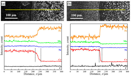 Unfortunately, there is a larger error in the carbon detection results using the EDS because carbon is a lightweight element [22]. The diffusion of carbon elements is not apparent in Figure 5, which exhibits the EDS linear scan analysis of C, Fe, Cr, and Ni across the interface between the DSS and LAS. However, it can be observed that the peak of the carbon content in the DSS side is lower than that of the LAS side. Furthermore, an apparent interdiffusion can be observed in both the as-deposited and rolled materials. There is a marked decrease in the content of the elements Cr, Ni, and Mo from the DSS side to the LAS side, while the content of the element Fe increases significantly. Notably, the diffusion distance (~25 μm) of Cr in the rolled metal is clearly smaller than that (~40 μm) in the as-deposited metal. Although the rolling process is more conducive to the diffusion of elements, the formation of chromium carbides inhibits the diffusion of Cr from the DSS side to the LAS side [18]. A large amount of austenite, rather than ferrite, appears on the DSS side near the interface, even though the diffusion of Cr, which promotes ferrite formation, is inhibited, and Ni, which promotes austenite formation, further diffuses from the DSS side to the LAS side. The main reasons for this are that (i) compared with the lower Ni content (4.84%), the diffusion of Cr (23.1%) from the DSS side to the LAS side inhibits the formation of ferrite, and (ii) the long-range diffusion of C from the LAS side to the DSS side promotes the formation of austenite.
