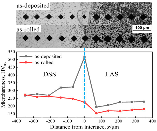 Figure 6 shows the hardness variation across the interface of the as-deposited and as-rolled metals. It is clearly observed that the hardness at the interface decreases significantly from 516.4 HV0.2 in the as-deposited metal to 225.6 HV0.2 in the rolled metal. In addition, regardless of rolling, the hardness decreases remarkably and then rises slowly from the interface to the LAS side, but the hardness in the as-deposited material is slightly higher than in the rolled material. The reason for this is that the thin proeutectoid ferrite near the interface transforms into a decarburized layer, and the Widmanstӓtten with high carbon content away from the interface transforms into pearlite plus ferrite. Interestingly, the hardness variation on the DSS side is different from that of the LAS side. The hardness in the rolled metal rises slowly from the interface to the DSS side due to the disappearance of the interfacial phase with high hardness. Meanwhile, in the as-deposited material, hardness decreases observably and then decreases slowly from the interface to the DSS side because carbides are precipitated. A few carbon atoms diffusing into the DSS from the LAS side are dissolved in austenite near the interface.