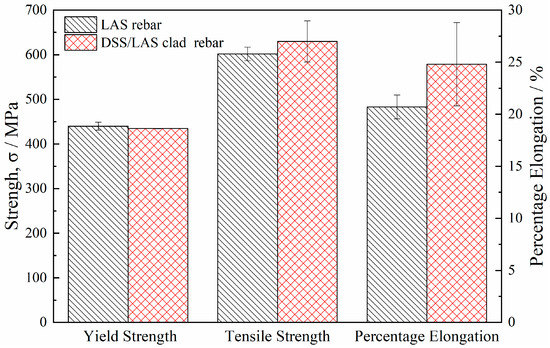 Compared with the LAS rebar, however, the change in yield strength of the DSS/LAS rebar is not significant, and the elongation increases slightly, as shown in Figure 8. The main reason for this is that, as mentioned above, the thickness of the DSS cladding is far less than that of the LAS core, indicating that the main contribution of mechanical properties comes from the LAS core itself.