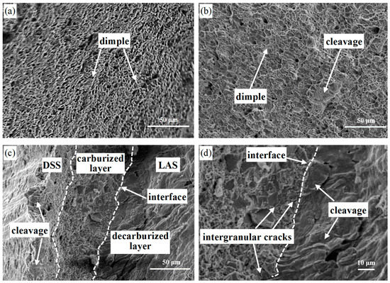 Figure 9. Fracture morphology of the DSS/LAS-clad rebar: (a) DSS cladding, (b) LAS core, (c,d) interface zone.