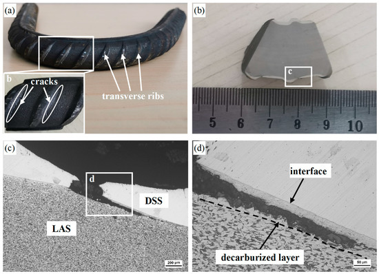 Figure 10. Results of the bending test of the DSS/LAS-clad rebar: (a) DSS/LAS-clad rebar after bending, (b) longitudinal section of the DSS/LAS-clad rebar after bending, (c,d) metallographic diagram of the crack.