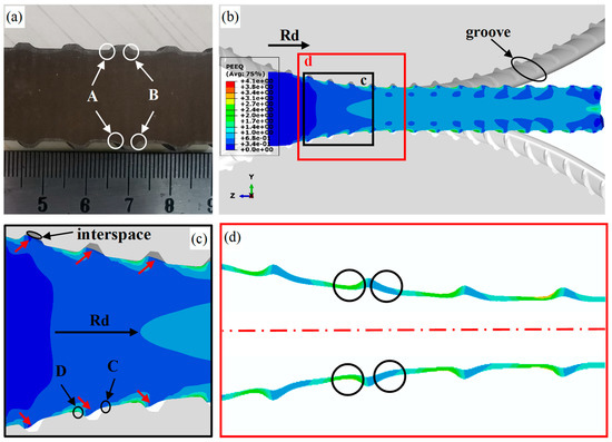 In order to further study the reduction in cladding thickness, the finite element method (FEM) was performed using ABAQUS software. The rollers are set as rigid bodies and the workpiece is set as a deformable body. The element type is C3D8RT, with a total of 369,840 elements, of which the cladding element size is 0.39 mm. The dense mesh setting is useful for accurately studying the deformation behavior of the cladding. It is worth noting that a common node mesh is used during the simulation to avoid the relative sliding of the LAS core and DSS cladding. Figure 11a shows the interface in the DSS/LAS-clad rear section. There are obvious differences in the thickness of the cladding on both sides of the transverse rib root, as shown in marks A and B in Figure 11a. Figure 11b,c show the results of the FEM simulation in the last rolling pass. The transverse rib root has a larger equivalent plastic strain value (marked in green) during rolling, as presented in Figure 11b, which shows that the transverse rib root undergoes severe plastic deformation compared with other parts of the DSS/LAS-clad rebar. Figure 11c shows that the workpiece presents a much larger deformation on the side of the inverse rolling direction (IRD, marked D) than on the side of the rolling direction (RD, marked C). Specifically, the equivalent plastic strain on the IRD is ~2.0, while the equivalent plastic strain on the RD is only ~0.34. In addition, it is also can be seen that the groove is not completely filled with the workpiece, which means that an interspace appears between the workpiece and the groove. After the workpiece enters the groove, the forming of the transverse rib undergoes the following stages: (i) the metal restricted by the groove flows freely in the transverse direction after the workpiece comes into contact with the front end of the groove (marked C in Figure 11c); (ii) the metal is restricted by the back end of the groove (marked D in Figure 11c), and then flows towards the side wall of the groove (red arrow). Therefore, there is a thin cladding with larger plastic deformation at the root of the transverse rib because the deformation of the DSS is significantly larger than that of the LAS. The result of the numerical simulation shown in Figure 11d agrees with the actual results. In order to determine how to effectively suppress the cladding thickness reduction and completely eliminate the interfacial martensite after rolling, it is necessary to further study the groove design and rolling temperature.