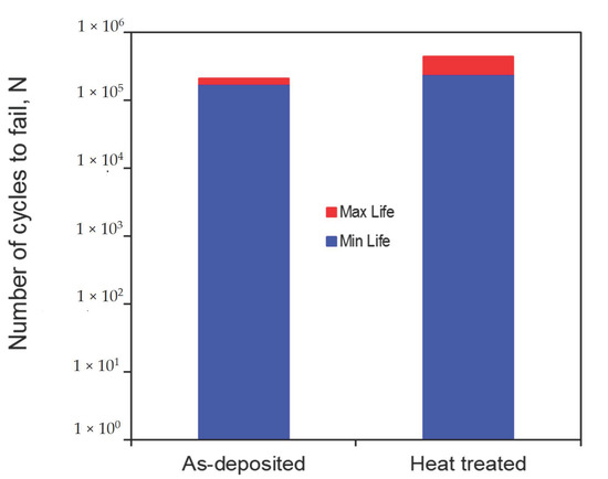 Based on the tensile tests [34], corrosion fatigue tests were conducted for as-deposited (AD) and heat-treated 300 °C conditions. The fatigue tests were performed using an Instron RR Moore four-point rotating-bending fatigue testing machine (Norwood, MA, USA) in a fully reversed (R = −1) load-controlled condition. The tests were conducted at a fixed stress amplitude of 100 MPa and a frequency of 30 Hz. Corrosion fatigue tests were conducted in the customized chamber where 3.5% NaCl solution was used as an electrolyte. At least two samples were tested in each condition. Detailed fatigue setup can be seen in [18]. In addition, fracture surfaces were investigated using Field Emission Scanning Electron Microscopy(FE-SEM) equipped with EDX.