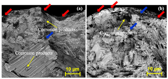 Figure 7 portrays the corrosion fatigue fracture surfaces of AD and 300 °C heat-treated samples tested at a stress amplitude of 100 MPa. Both samples show similar types of fracture behavior during testing. No debonding identified in both cases indicates strong interfacial bonding between coating and substrate. The fatigue fracture surface shows large corrosion pits (red arrows in Figure 7) with visible cracks in the coating. At the same time, localized cavities (blue arrow in Figure 7) and hairline cracks were identified on the fracture surfaces, allowing the NaCl solution to enter and react with the substrate’s interface. Those pits grow over time and transform into a large cavity, potential sites for the stress concentration caused by the initiation of cracks. Multiple cracks originating from concave surface corrosion pits advancing along the final fracture zone were observed (Figure 7). The corrosion products, including the oxides and hydroxides, are displayed on both fracture surfaces. A detailed analysis of the corrosion products can be seen in [20].