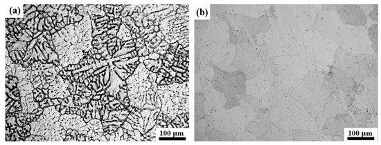 The raw material of AA2195 Al-Li alloy ingots, with a diameter of 190 mm, was fabricated by melting and casting (supplied by Light Alloy Research Institute, CSU), the chemical composition of which (Measured by ICP spectrometer, SPECTRO BLUE SOP, Kleve, Germany) is listed in Table 1. The samples for experiments and observations were cut from the cross section of the ingots at a position three quarters of the way from the center of the initial ingot. Then, a part of this batch of samples was left untreated and the other part was homogenized. The ingot was homogenized at 500 °C for 26 h and then air-cooled to get homogenized HG 2195 samples. Two state samples were taken separately for microstructure observation using OM (model XJP-6A), and the initial microstructure of AC and HG Al-Li alloys are shown in Figure 1a,b, respectively.