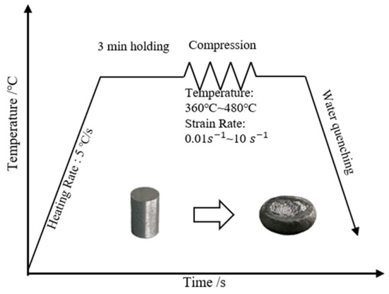 Hot compression experiments were performed using a Gleeble-3150 (Dynamic System Inc. USA) thermo-mechanical simulator. Based on the ASTM-E9 standard [19], AC and HG Al-Li alloy ingots were processed into cylindrical samples (ϕ8 mm × 12 mm). Hot compression tests were conducted on all samples with total deformation of 75%, between 360 °C and 480 °C with increments of 30 °C, and strain rates in the range 0.01 to 10 s−1. A graphite lubricant was applied on both ends of the cylindrical samples to reduce friction during compression. The specimens were heated at a rate of 5 °C/s until reaching the target temperature and were then held at this temperature for 3 min before hot compression. Then, the compression tests were stopped at true strain of 1.3% and the samples were directly water-quenched. The schematic diagram of the hot compression process is shown in Figure 2. The true stress–true strain curves were acquired from compression tests and the processing maps for the AC and HG AA2195 Al-Li alloys were established.