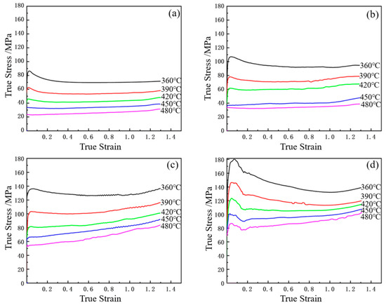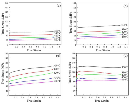 True stress–true strain curves for hot compression deformation of AC AA2195 Al-Li alloy at different temperatures and strain rates: (a) 0.01 s−1, (b) 0. 1 s−1, (c) 1 s−1, (d) 10 s−1.