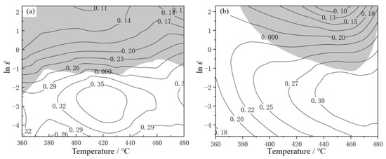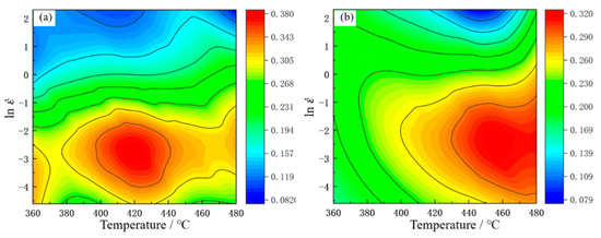 Fitting different η values, strain rate and deformation temperature, the power dissipation efficiency map of AC and HG AA2195 Al-Li alloys were obtained, and the results are shown in Figure 5. In the maps, when the color changes from blue to red, the value η was increasing. Normally, the η values associated with DRX and DRV are considered to be 0.35–0.45 and 0.2–0.3, respectively [24,25]. The results revealed that there was a greater tendency for DRX to occur in the AC AA2195 Al-Li alloy at a strain rate of 0.01–0.1 s−1 and temperature of 400–440 °C (η > 0.35), while the HG AA2195 Al-Li alloy was dominated by DRV at temperatures above 440 °C (η < 0.3).