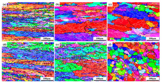 IPF maps of the AC AA2195 Al-Li alloy under different thermal deformation conditions: (a) 360 °C, 0.01 s−1; (b) 420 °C, 0.01 s−1; (c) 480 °C, 0.01 s−1; (d) 360 °C, 0.01 s−1; (e) 420 °C, 0.01 s−1; (f) 480 °C, 0.01 s−1.