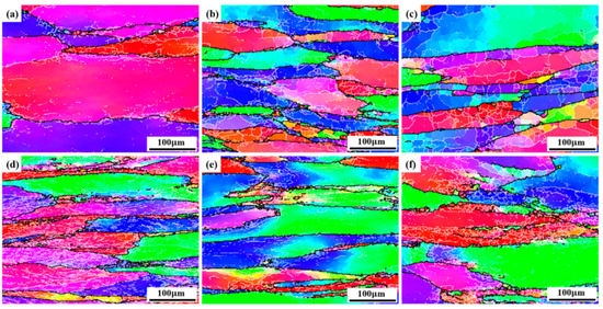 IPF maps of HG AA2195 Al-Li alloy under different thermal deformation conditions: (a) 360 °C, 0.01 s−1; (b) 420 °C, 0.01 s−1; (c) 480 °C, 0.01 s−1; (d) 360 °C, 10 s−1; (e) 420 °C, 10 s−1; (f) 480 °C, 10 s−1.
