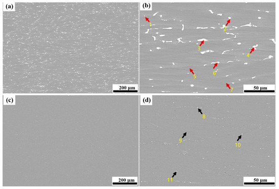 The SEM micrographs of the AC and HG AA2195 alloys with low and high magnifications are shown in Figure 9a–d. A large number of discontinuous fine residual eutectic phases can be observed in the AC fabric, while, on the contrary, non-equilibrium phases are found in the HG fabric. The eutectic phases dissolved into the matrix after homogenized treatment. In addition, some representative eutectic phases (marked by arrows and numbers) were selected for EDS analysis, and the corresponding results of their compositions are shown in Table 2. According to the EDS results, the eutectic phases were mainly composed of Mg and Cu elements. The effects of these diffused eutectic phases on the DRX and DVR of AA2195 Al-Li alloy is discussed below.