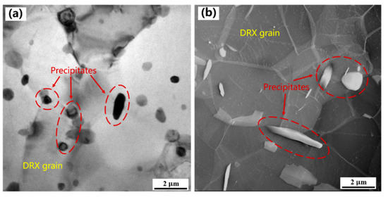 To better explain the hot compression properties of AC AA2195 Al-Li alloy, the precipitates, GOS maps and recrystallization of the samples were analyzed for the two alloys after compression. Figure 10 shows the TEM bright field and dark field images of the AC AA 2195 alloy. The areas marked with red dashed lines in the figure are precipitates, and the grains marked with yellow letters are recrystallized grains. It can be seen that there were a large number of precipitates of large size inside the recrystallized grains and out of the grain boundaries. During the deformation process, the matrix bypasses these large precipitates and forms dislocation rings around them. The Al matrix near the precipitates underwent coordinated deformation, which led to an increase in energy storage around the precipitates, and these regions were more prone to recrystallization under large energy storage conditions. The results of TEM showed that some phases of 1–2 um in size were present in the AC AA2195 Al-Li alloy. These Al-Cu phases were distributed in as-cast alloy along the grain boundaries of the recrystallized grains by diffusion. Based on the particle excited nucleation (PSN) theory, in the AC AA2195 alloy, the distributed residual precipitates provide more nucleation sites for DRX and DRV. Therefore, DRX and DRV mechanisms are significantly facilitated and the material softens. Compared to the HG AA2195 Al-Li alloy, this was the main factor for the AC AA2195 alloy to achieve lower rheological stress.