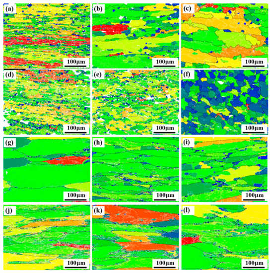 KAM and recrystallization of AC and HG AA2195 Al-Li alloy under different hot deformation conditions: (a) AC-360 °C /0.01s−1, (b) AC-420 °C /0.01s−1, (c) AC-480 °C /0.01s−1; (d) AC-360 °C /10s−1, (e) AC-420 °C /10s−1, (f) AC-480 °C /10s−1; (g) HG-360 °C /0.01s−1, (h) HG-420 °C /0.01s−1, (i) HG-480 °C /0.01s−1; (j) HG-360 °C /10s−1, (k) HG-420 °C /10s−1, (l) HG-480 °C /10s−1.