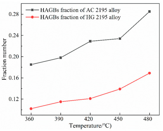 Normally, HAGBs are used to represent the recrystallization processing level of samples, and the higher the value is, the more grains of dynamic recrystallization there are [27,28]. The percentages of HAGBs in the alloys in the two states were counted using Channel 5 software, and the results are shown in Figure 12. The results showed that the percentage of HAGBs in the AC AA2195 alloy was much higher than that in the HG AA2195 alloy. These results were evidence that the recovery and recrystallization processing levels of the AC AA2195 alloy were higher than those of the HG 2195 alloy.