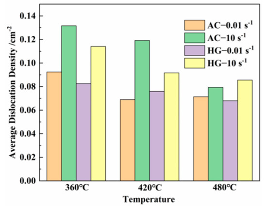 Figure 13 shows the KAM values for different temperatures and strain rates. The results indicated that the main trend of KAM values for both alloys was a gradual decrease with temperature increase, but the values of the AC AA2195 alloy were still higher than those of the HG AA2195 alloy under the same conditions. This indicated that a more intense deformation occurred internally in the AC AA2195 alloy. Figure 14 exhibits the KAM and corresponding recrystallization images of AC and HG AA2195 Al-Li alloy under different deformation strain rate and temperature. The color in the KAM plot changed from blue to red, which indicated that the local dislocation gradually increased. In the recrystallization plot, the blue regions represent the recrystallized grains during hot deformation. Compared with the HG AA2195 alloy, the recrystallization areas of the AC AA2195 alloy were more obvious. Due to DRX and DRV, the AC AA2195 alloy became more softened and had better hot workability during deformation. From the KAM plot analysis, it can be seen that the KAM decreased with increasing temperature and the dislocation density in the AC AA2195 alloy was higher than that of the HG AA2195 alloy at 420–480 °C, since the DRX of the AC AA2195 alloy increased at higher temperature and the density of dislocations decreased. During the compression process, the grains in the AC AA2195 alloy experienced a process of dislocation proliferation to recrystallization and then to dislocation proliferation. Therefore, the materials had better hot workability.