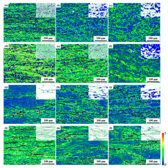 Grain orientation spread (GOS) plots of AC and HG AA2195 alloy in different deformation conditions: (a) AC-360 °C /0.01s−1, (b) AC-420 °C /0.01s−1, (c) AC-480 °C /0.01s−1; (d) AC-360 °C /10s−1, (e) AC-420 °C /10s−1, (f) AC-480 °C /10s−1; (g) HG-360 °C /0.01s−1, (h) HG-420 °C /0.01s−1, (i) HG-480 °C /0.01s−1; (j) HG-360 °C /10s−1, (k) HG-420 °C /10s−1, (l) HG-480 °C /10s−1.