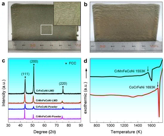(a,b) DED-fabricated samples of CoCrFeNi and CrMnFeCoNi, respectively; (c) XRD spectrums and (d) DSC curves of the CoCrFeNi and CrMnFeCoNi MPEAs.