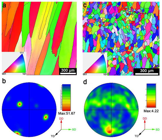 In order to further understand the function of Mn addition on the microstructure of DED-fabricated CoCrFeNi MPEA, the inverse pole figure (IPF) and pole figure (PF) of the samples obtained through EBSD analysis are presented in Figure 2. Figure 2a presents the IPF map of the CoCrFeNi samples, with the columnar grain microstructure being ~1.2 mm in length and ~0.2 mm in width. Furthermore, the corresponding PF of CrFeCoNi shows that the orientation of most of the grains through the deposited direction are close to the <100> direction, exhibiting a strong texture, as displayed in Figure 2b. However, the IPF map in Figure 2c exhibits that the CrMnFeCoNi consists of the equiaxed grain with a mean size of ~150 μm. Figure 2d shows a random texture due to the occurrence of CET for DED-fabricated CrMnFeCoNi MPEAs.