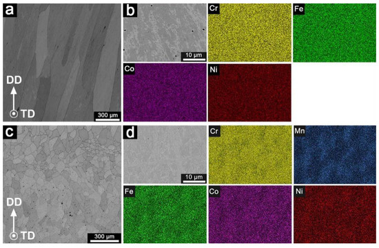 Furthermore, the distribution of elements in each alloy has been comparatively examined. Figure 3a,b show that Co, Fe, Cr, and Ni are homogeneously distributed in CoCrFeNi with equiaxed grain microstructure samples. However, the CrMnFeCoNi with columnar grain microstructure samples exhibits dendrites enriched in Co, Fe, and Cr and interdendrimers enriched in Ni and Mn, as shown in Figure 3c,d. It is known that Mn and Ni have melting points of 1517 K and 1726 K, respectively, while Co, Cr, and Fe have melting points of 1768 K, 2130 K, and 1808 K, respectively. According to the report, the CrMnFeCoNi HEA can be described by a schematic phase diagram of the CrFeCo-MnNi system consisting of a liquid and a solid can be described by analogy with a completely miscible binary alloy [32]. Therefore, Mn and Ni, with lower melting points, are easily enriched in the interdendrites during the solidification of an alloy, as shown in Figure 3d.