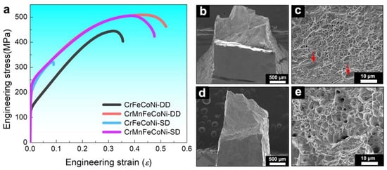 (a) The tensile curves of CoCrFeNi and CrMnFeCoNi along different direction; (b–e) the fracture surface of the CoCrFeNi (b,c) and CrMnFeCoNi (d,e) samples after tensile testing along the scanning direction.