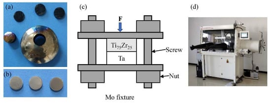 Pure metal nuggets of Ti, Zr, and Ta with a purity of 99.99 at.% were used as the raw materials. Those high-pure metal nuggets were bought from the China New Metal Materials Technology Co., Ltd. The chemical compositions of the pure metal nuggets are listed in Table 1. The metals of Ti and Zr were weighed with a ratio of 61.16∶38.84; namely, the atomic ratio of 75∶25. The weighed Ti and Zr were melted by using a non-consumable arc melting furnace under an argon atmosphere. Before melting, the furnace was vacuumed to 5 × 10−5 Pa and then filled with argon; this was repeated three times. Considering the uniformity of the composition, the ingots were turned over and remelted four times. Disc specimens with a diameter of 5 mm and a thickness of 3 mm were cut from those uniform ingots, as shown in Figure 1a. The specimens of Ta with the same size as the Ti75Zr25 alloy were directly cut from the commercial pure Ta. Those disc specimens, including Ti75Zr25 and Ta, underwent grinding, polishing, cleaning, and drying surface cleaning processes to prepare the diffusion specimens, as shown in Figure 1b. After surface cleaning, those specimens were immediately transferred into the argon atmosphere. The diffusion specimens were assembled into a pure Mo fixture, as shown in Figure 1c. Before assembling, a force of 7 kN was loaded onto the specimens to maintain a slight plastic deformation of Ta, of which the yield strength was 320 MPa [26], to ensure a tight contact between those two diffusion specimens. Cubic boron nitride powders were dispersed onto the surface of each connecting part to facilitate the demolding. The whole assembly was processed in a vacuum glove box with a press, which was also under the argon atmosphere, as shown in Figure 1d. After assembling, the specimens were annealed at 1000 °C for 100 h in a vacuum furnace under the argon atmosphere. Before annealing, the furnace was vacuumed to 5 × 10−5 Pa and then filled with argon; this was repeated three times. The annealed specimens were cut in half and underwent a preparation process of the metallographic specimen for the next modulus and composition measurements.