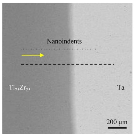 Figure 2 shows the optical microscopy image near the boundary of the diffusion couple after annealing at 1000 °C for 100 h. In that image, the boundary of the diffusion couple was blurry. That was because of the interdiffusion of the elements. The small triangles in Figure 2 were the indents of the nanoindentation tests. The arrow in Figure 2 shows the direction of the nanoindentation test. The first indent position was defined as the onset; namely, the distance was 0. A variation in the elastic modulus with the distance is shown in Figure 3a. The points with an elastic modulus over 100 GPa on the Ta-rich side are not shown. From Figure 3a, the elastic modulus was maintained around 103 GPa when the distance was below 200 μm. After that point, the modulus slowly decreased with an increase in the distance. When the distance was higher than 400 μm, the modulus sharply decreased. The lowest modulus value of 61.3 GPa appeared at a distance of 525 μm. As the test continued, the modulus tardily increased at first and then closed to 100 GPa. The EMPA scan location is also shown as a dashed line in Figure 2. As the elastic modulus of the Ta-rich side was relatively high, the nanoindentation test stopped at a distance near 800 μm, which was still in the diffusion area. Thus, the EPMA test distance was longer than the nanoindentation. Compositions from 0 to 1000 μm were tested; the compositions at various distances are shown in Figure 3b. The alloying composition remained stable at distances below 200 μm and over 800 μm. A rapid variation in the composition was observed at distances between 625 μm and 650 μm. According to the diffusion theory, the composition should have sharply changed near the diffusion boundary. Thus, it could be inferred that the diffusion boundary of this couple should have been at a distance of 650 μm. Based on this deduction, and combined with the composition files in Figure 3b, the diffusion distances of Ti and Zr to Ta were approximately 450 μm, from 200 to 650 μm. That of Ta to Ti75Zr25 was approximately 150 μm, from 650 to 800 μm. This obvious difference in the diffusion distance mainly resulted from various diffusion coefficients. Liu et al. [32] reported the mobility of Ti in Ta and Ta in Ti through theoretical calculations and experimental verifications. The results showed that the mobility of Ta in Ti was fast. Thus, there would be a long tail on the Ti-rich side. Ansel et al. [33] also measured the diffusion composition files of a Ti/Ta couple annealing at 1500 °C for 3 h and showed similar results to this work.