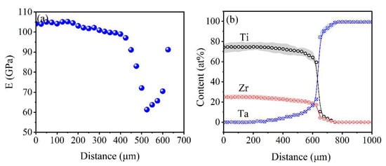Titanium alloys are widely used in fields such as aerospace, medical, shipping, and chemical because of their low density, high strength, fatigue resistance, and good biocompatibility. Recently, Ti alloys as medical materials have attracted more and more attention thanks to their low elastic modulus, non-cytotoxicity, high strength, and corrosion resistance, for example [1,2,3]. The group of Niinomi committed to the mechanical properties of medical titanium alloys and supplied a few new beta Ti alloys with a low elastic modulus for preventing stress shielding between implant devices and bones [4,5,6,7]. Steinemann [8] and Kawahara [9] showed that the elements of Ti, Zr, Nb, Ta, and Pt exhibit excellent biocompatibility and biological activities with no cytotoxicity. Thus, many publications around low elastic Ti alloys with those elements have been reported such as the Ti-Nb series [10,11,12,13], the Ti-Zr series [14,15,16], and the Ti-Ta series [17,18,19] of alloys. Popov et al. [20] investigated the effect of heat treatments and plastic deformation on the structure and elastic modulus of an IMP-BAZALM (Zr-31Ti-18Nb (at.%)) biocompatible alloy. The micro-indentation showed that an elastic modulus lower than 60 GPa was obtained after a suitable treatment. The discussion proved that the appearance of the α″ and ω phases in the structure of the alloy led to an increase in the modulus of elasticity. The greatest increase in the modulus was observed under the conditions corresponding with the formation of the ω phase. Liang et al. [21] summarized low modulus Ti alloys without cytotoxic alloying elements. The lowest elastic modulus of the developed Ti alloys, especially foam Ti alloys, was very close and even lower than biological bone (10~30 GPa). However, most of those results were obtained using trial-and-error methods or semi-empirical methods. Those methods can only select a few special composition points to have an attempt and are likely to omit potential compositions with better or ideal performances. Diffusion multiples is an efficient high-throughput method for alloy composition screening. Chen [22] investigated the diffusion coefficient and elastic modulus of Ti-X (Nb, Mo, Ta, and Zr) binary alloys through the diffusion multiples method and reported on the diffusion data and composition dependence of the elastic modulus of those binary Ti alloys. However, most previous reports have been used for binary Ti alloys. Recently, the diffusion multiples method was attempted to be used for the composition screening of ternary alloys and other component alloys. Ling et al. [23] investigated the variation in the modulus with the composition by using a Ti-Nb-Mo/Ti-Nb-Zr/Ta diffusion couple and obtained a possible composition range with a low modulus.