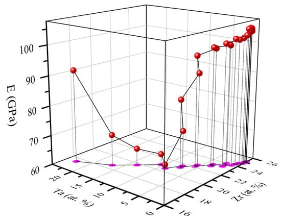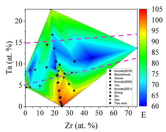 To be a reference and guidance for the development of Ti alloys with a low elastic modulus, our results combined the previously reported data [17,18,19,42,43,44,45,46,47] of TiZrTa alloys; the results are shown in Figure 8. The compositions of the TiZrTa alloys in the blue and light blue areas were expected to have a lower modulus. The blue and light blue areas were between the two purple dashed lines. That is, the TiZrTa alloys with a Ta content between 5 and 17.5 at.%, almost regardless of the Zr content (0 to 76 at.% in Figure 8), were likely to have a low modulus. In order to more accurately represent the composition range expected to have a low modulus, those two dashed lines were digitized. The equation of the top dashed purple line—namely, the upper compositional limits of Zr and Ta—could be expressed as Ta = 2.63 × 10−2 Zr + 15. Correspondingly, the lower limit obeyed the equation of Ta = 8.42 × 10−2 Zr + 15. It is well-known that the element of Ta is a typical isomorphous stabilizer of the beta phase for Ti alloys [48]. Thus, a small change in the content of Ta would obviously affect the stability of the beta Ti phase and the formation of the transitional phases of α” and ω as well. As mentioned above, the stability of the beta phase is a major factor influencing the elastic modulus of Ti alloys. Thus, Ta should be a narrow range for Ti alloys expecting a low elastic modulus. Zr is categorized as the neutral element of Ti alloys [24,48]. Thus, the content of Zr in TiZrTa alloys has a weak effect on the elastic modulus. However, a few publications [49,50,51,52] have indicated its beta stabilizing effect when over 10% Zr was added to the Ti alloys. In addition, Liang et al. [25] theoretically showed that the addition of Zr into Ti alloys with one or more beta stabilizers could strengthen the effect of the beta stabilizers. Several experimental results [53,54,55] have also indicated the same effect of a Zr addition into Ti alloys with beta stabilizers. Thus, as the Zr content increases, the low elastic modulus of TiZrTa alloys needs to decrease the Ta content. That was the reason for the narrower range of the Ta content as the Zr content increased, as the distance between the two purple dashed lines in Figure 8 shows. Marker et al. [56] proposed a variation of Young’s modulus with the composition of TiZrTa ternary alloys by a pure theoretical calculation, as Figure 9 shows. The Young’s modulus map in Figure 9 shows that the alloys in the Ti corner with Ta < 20 at.% and Zr < 10 at.% or that in the Zr corner with Ta < 25 at.% and Ti < 20 at.% had a modulus below 70 GPa. The range of the Ta content was similar to this work, but the Zr content as different. The reason was that the moduli in Figure 9 were calculated for the pure beta phase. For a few areas, such as near the TiZr binary areas, the beta phase was unstable and could not be retained at room temperature. Thus, the calculated results in those areas was suspicious and further discussion was required. The other key factor of the difference was that there were other phases, such as the α’, α”, and ω phases, in the actual TiZrTa alloys with a low Ta content, not only the beta phase.
