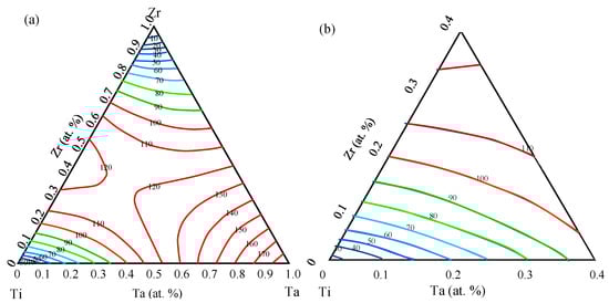 Calculating Young’s moduli (a) and Ti corner partial image (b) of TiZrTa ternary alloys with a pure beta phase [56].