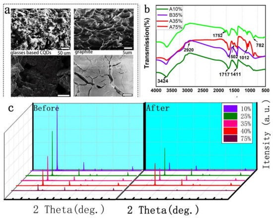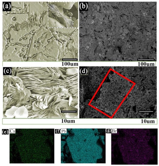 The CQDs glass shown in Figure 1a–c shows the Cs4PbBr6 quantum dot. This shows a glass bulk. After the Cs4PbBr6 quantum dot glass-ceramic is ground into powder, its surface morphology has a dendritic distribution, and the particle size is about 8 um, which is in the range of quantum dots [18]. Figure 1b–d show the morphologies after 35 wt% CQDs/65 wt% G. The Cs4PbBr6 quantum dot is dispersed on the surface of graphite and is fluffy and porous. The distribution of the Cs4PbBr6 quantum dot was further analyzed through the element distribution diagram, and the results are shown in Figure 1e–g. A Cs4PbBr6 quantum dot glass–ceramic is uniformly dispersed on the surface of graphite.