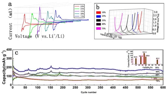 When we make it for a lithium anode (60% active material, 30% acetylene black, 10% PVDF), as Figure 2c shows, the 35% CQDs/G exhibited a good electronic performance (158.6 mAh g−1) compared with 10%, 25%, 40%, 75% CQDs/G capacity. The capacities of 10%, 25%, 40%, 75% CQDs were 65.4 mAhg−1, 103.4 mAhg−1, 103.2 mAhg−1, 60.1 mAhg−1, respectively. As Figure 2a,b show, 10%, 25%, 35%, 40%, 75% CQDs/G had the same CV curve and charge–discharge curve. This shows that the 10%, 25%, 35%, 40%, 75% CQDs/G have the same charge/discharge mechanisms: 10%, 25%, 40%, 75% CQDs/G.