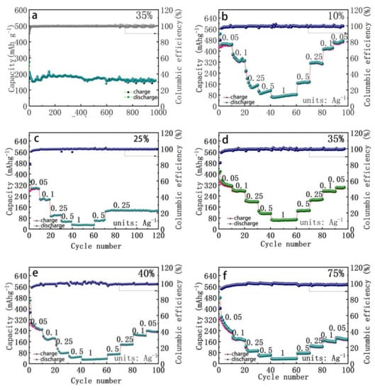 The cycle times were then increased to 1000 and taking the rate test at different current densities. As Figure 2a shows, after 1000 cycles, 35% CQDs/G remained with 158 mAh g−1, and exhibited significant stability. The EC of CQDs/G is 82.4% was better than the other CQDs/G contents. We also tested the rate of 10%, 25%, 35%, 40%, 75% CQDs/G. As Figure 3b–f shows, at 0.05 Ag−1, 0.1 Ag−1, 0.25 Ag−1, 0.5 Ag−1, 1 Ag−1, 0.5 Ag−1, 0.25 Ag−1, 0.1 Ag−1, 0.05 Ag−1. At 1 Ag−1 current density, all of them has showed excellent rate capability. Obviously, the 35% CQDs/G capacity remains at 80 mAhg−1 in Figure 3d, and exhibits brilliant rate stability at different rates. The other CQDs/G contents also showed a stable rate performance; at 75%, the capacity in the initial cycle quickly declines. When CQDs increases to a certain degree, the graphite needs time to combine with CQDs.