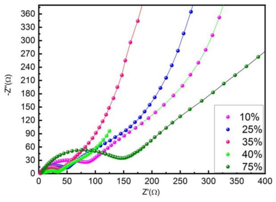 EIS of 10%, 25%, 35%, 40%, 75% CQDs/G after cycle.