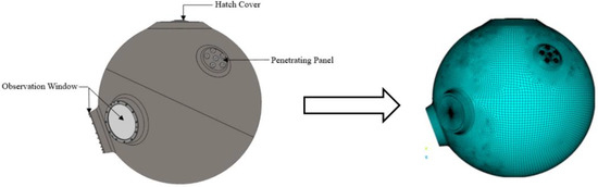 The static finite element analysis in ANSYS code by using bilinear material model is conducted to obtain the stress distribution characteristics in the critical zones of the spherical pressure hull. A sketch of the manned cabin involved in this study is shown in Figure 2, which is applied in a deep-sea manned submersible to the diving depth of 6000 m (the designed operation pressure will be 60 MPa). The manned cabin is composed of a pressure spherical hull, an access hatch cover, three observation windows, two electrical penetration panels and a set of hatch cover opening and closing mechanism. Its inner diameter and thickness are, respectively, 2100 mm and 68 mm. Three-dimensional element SOLID186, together with TARGE170 and CONTA174 used as the contact elements, are applied for modelling of the whole manned cabin. The spherical hull is divided into three layers elements in thickness (t) direction, and the overall mesh size is 40 × 40 mm × t/3. All parts of the manned cabin are refined according to the actual situation, and the hexahedral element is mainly used in the model. An average mesh size of 10 mm is applied. The high-strength titanium alloy Ti-6Al-4V ELI is used for the metal spherical hull and the material of the penetrating parts is stainless steel 17-4PH H925. The observation windows are manufactured by using PMMA (polymethyl methacrylate).